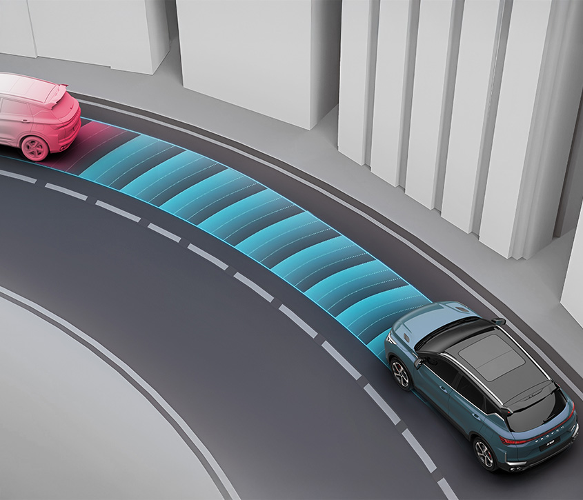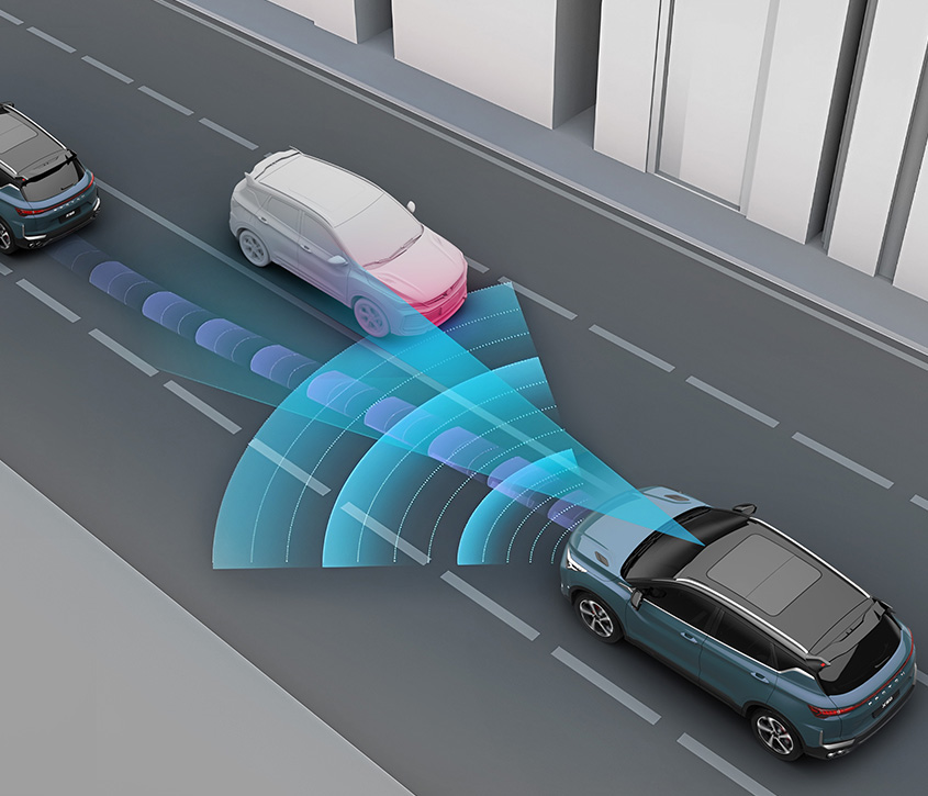 Speed and distance detection from the vehicle ahead with pre-set cruise control speed, even in stop-and-go traffic.